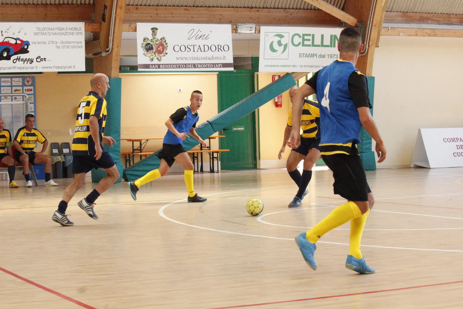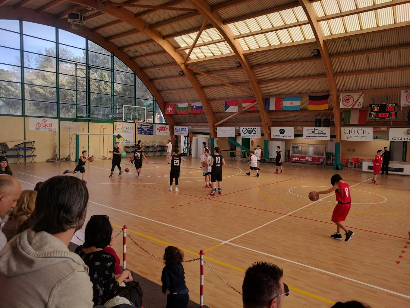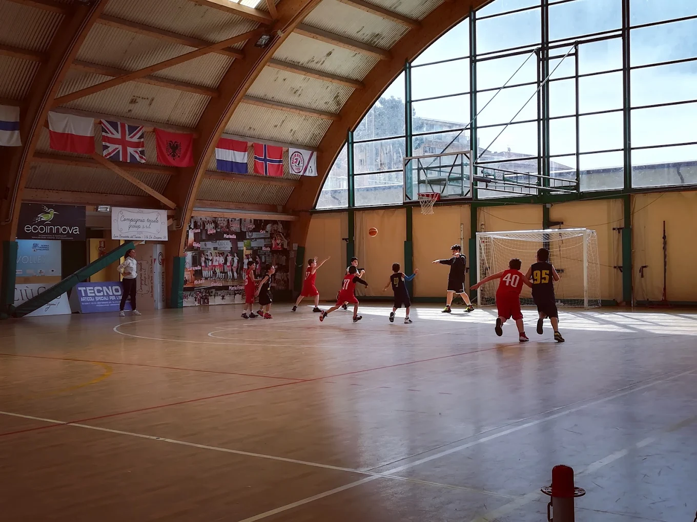 Volley, Basket, Calcio a 5, con tribuna. Spogliatoi per locali, ospiti, arbitri e docce con acqua calda. Infermeria, macchina caffè e bevande.